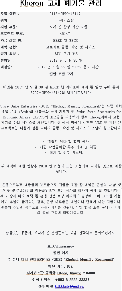 [타지키스탄]Khorog 고체 폐기물 관리 페이지 정보 Writer 관리자 Date19-08-18 00:46 Hit3,598회 Prev Next List 본문 Khorog 고체 폐기물 관리 Prev Next List