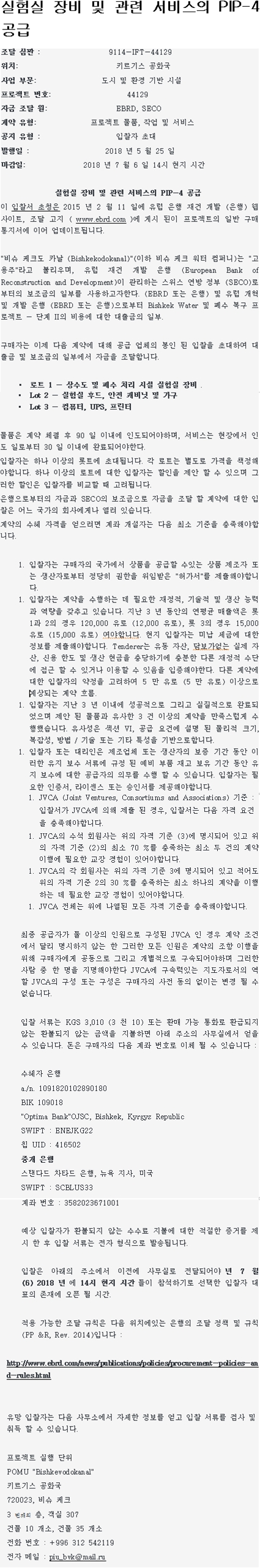 [키르기스스탄]실험실 장비 및 관련 서비스의 PIP-4 공급 페이지 정보 Writer 관리자 Date19-08-18 00:48 Hit4,015회 Prev Next List 본문 [키르기스스탄]실험실 장비 및 관련 서비스의 PIP-4 공급 실험실 장비 및 관련 서비스의 PIP-4 공급 http://www.ebrd.com/news/publications/policies/procurement-policies-and-rules.html Prev Next List